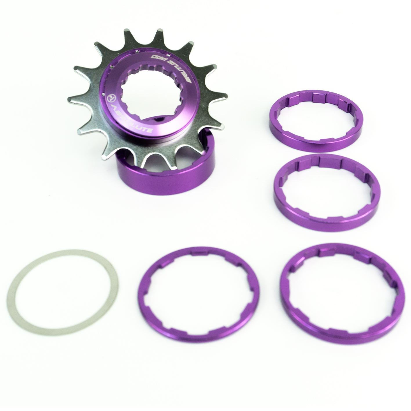 Kit conversão single speed Absolute Brutus Pro alumínio, cog em aço 14 dentes, 5 espaçadores variados anodizados roxo, para núcleos HG de 8 a 12vel