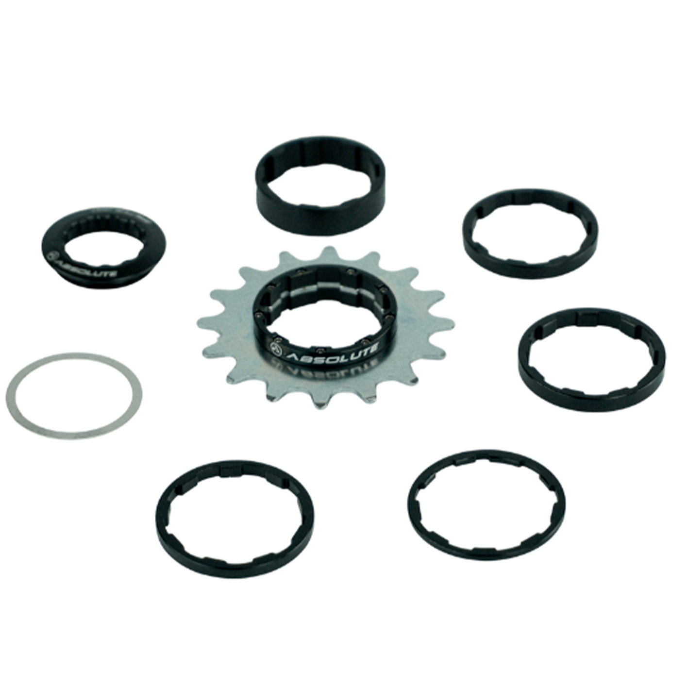 Kit conversão single speed Absolute Brutus Pro alumínio, cog em aço 16 dentes, 5 espaçadores variados anodizados preto, para núcleos HG de 8 a 12vel