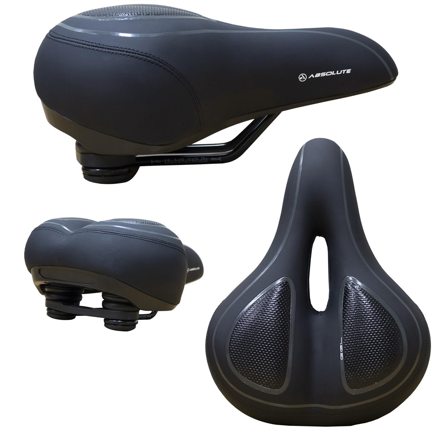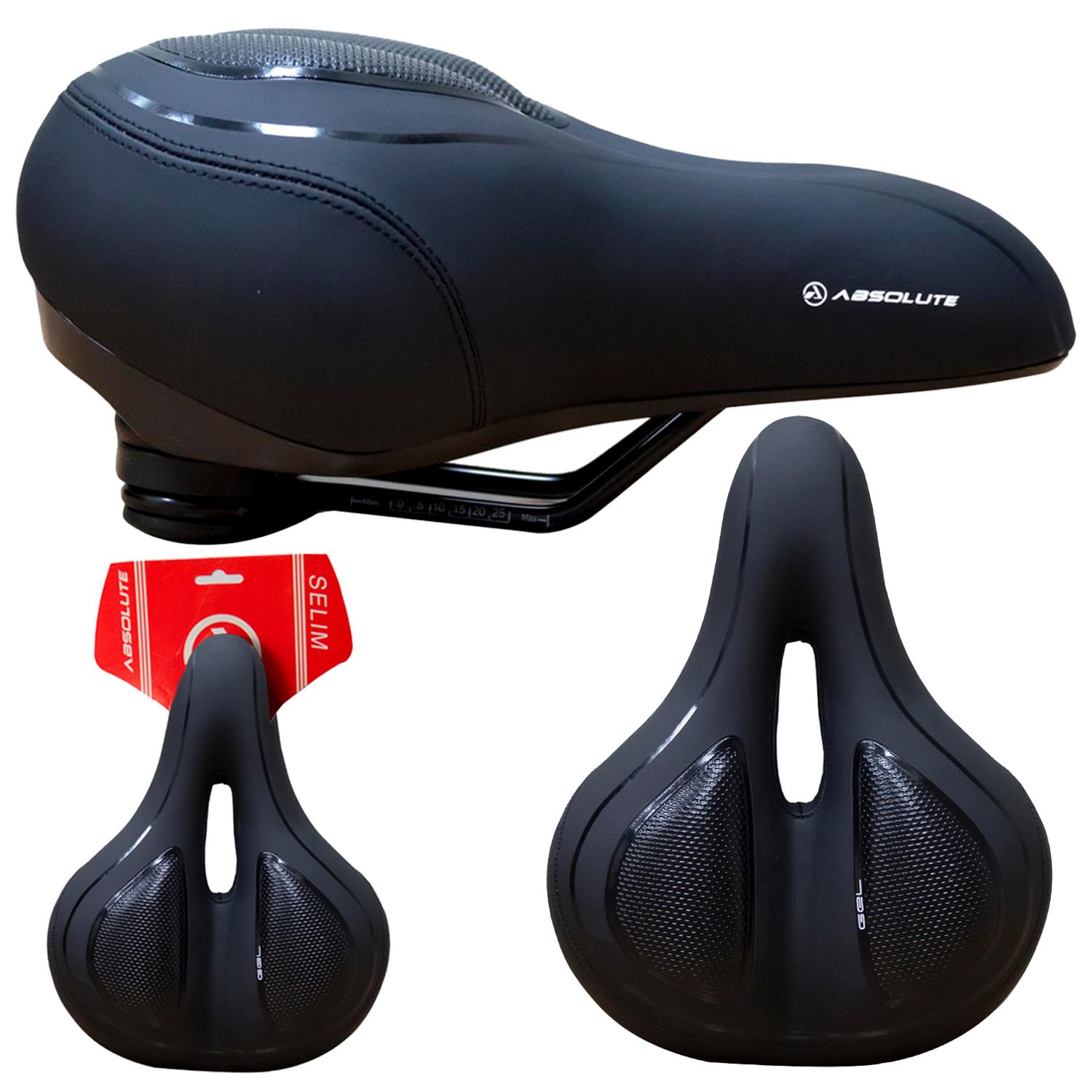 Selim Absolute Comfort, Vazado, Trilhos em Aço c/ Apliques em Gel Molas de Elastômero, Variações: preto/azul, preto/ciano, preto/cinza, preto/preto, preto/verde, preto/vermelho